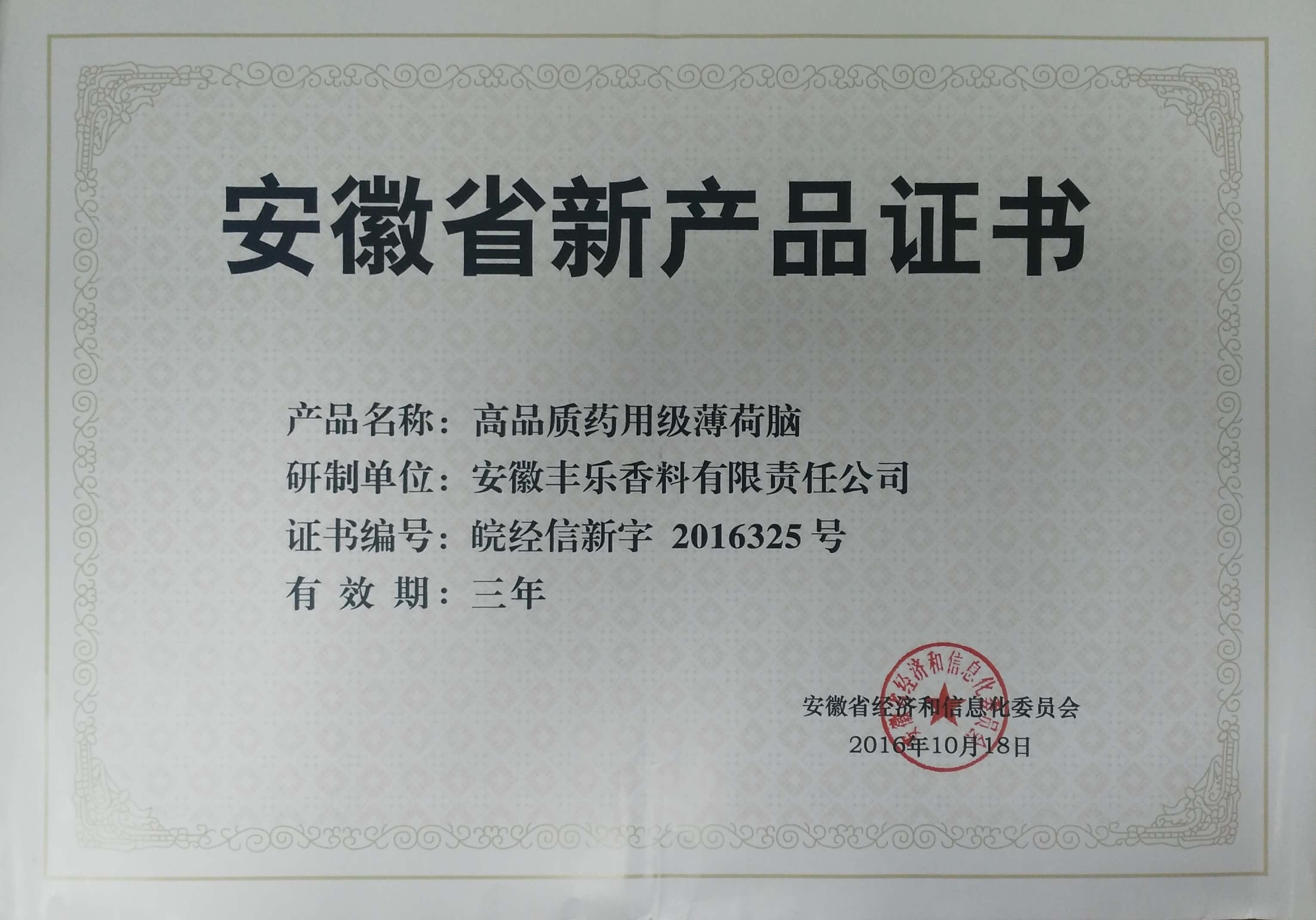 2016年-安徽名牌產(chǎn)品(豐樂牌天然薄荷腦)